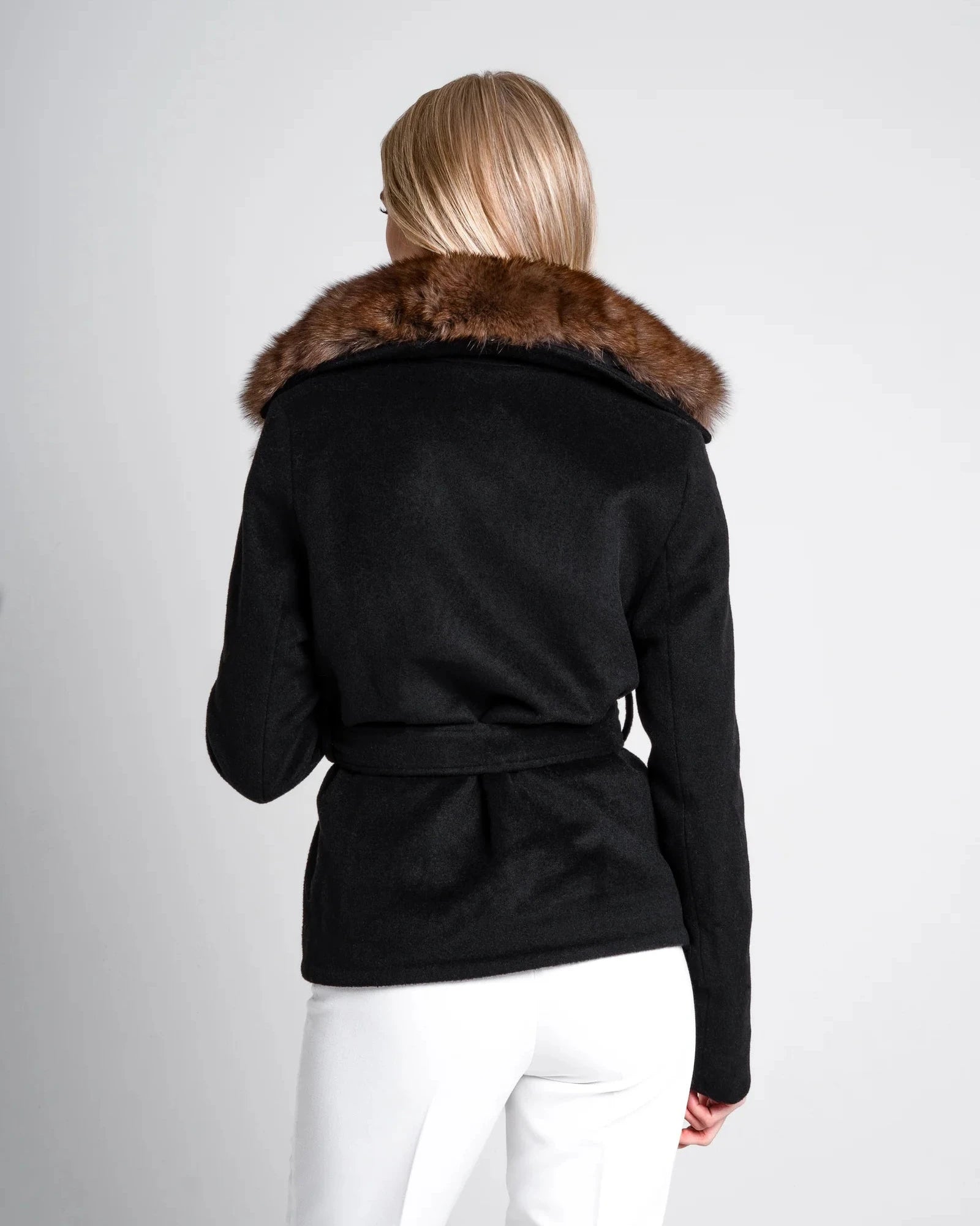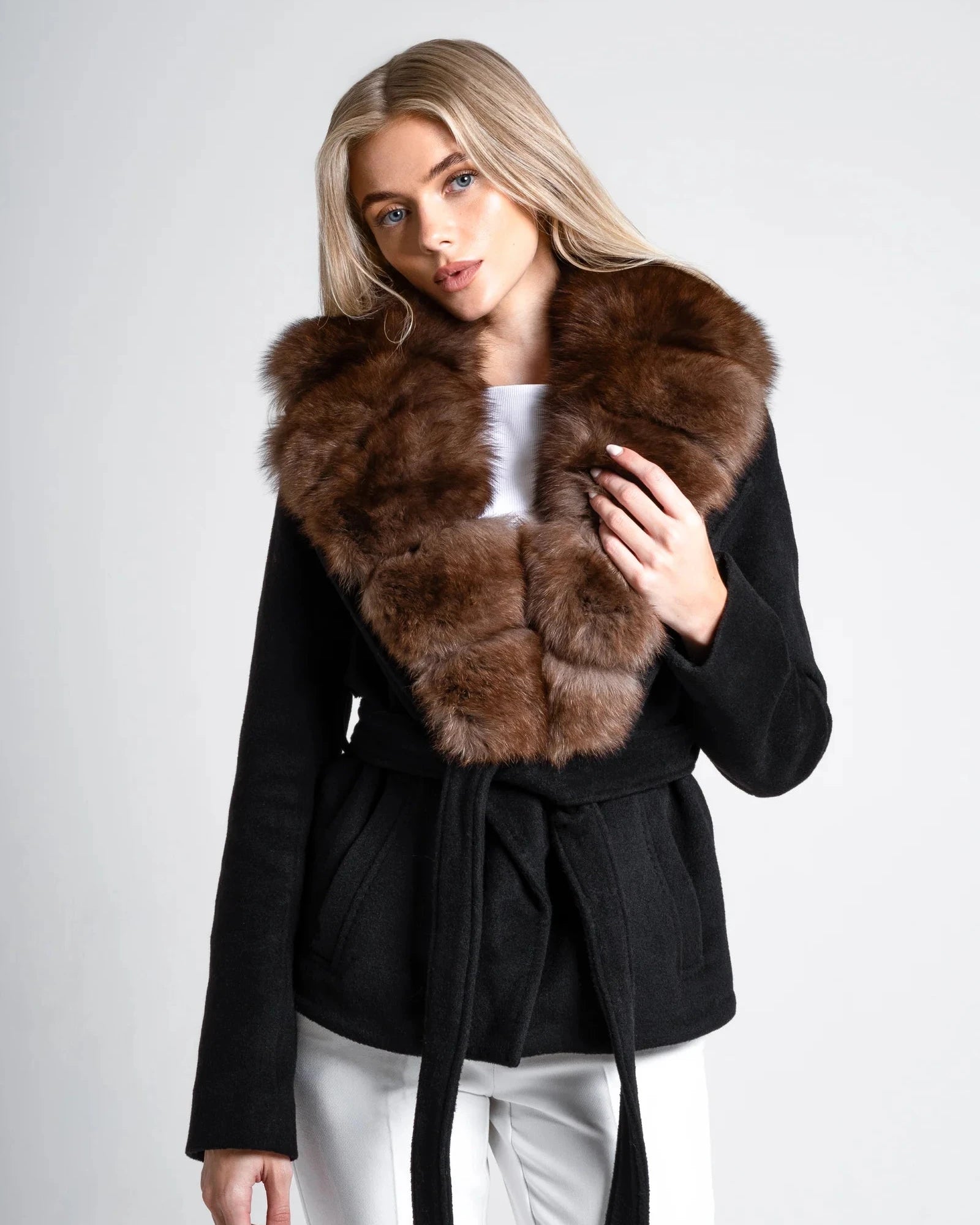 Rich, deep, and undeniably refined, the Renesmie Coat is defined by a sleek black silhouette contrasted with a removable fox fur collar in deep espresso coffee tones.