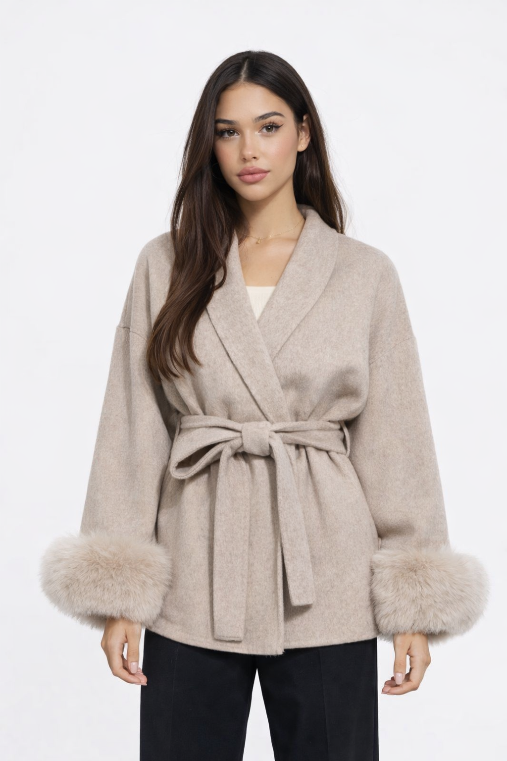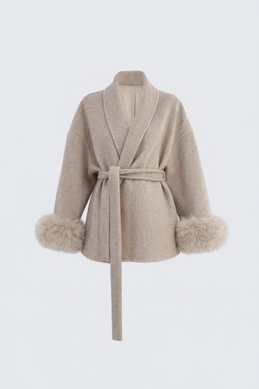 Elevate your style with our high quality Victoria Moss Wool Coat, a timeless and feminine wardrobe essential made for you walk in and instantly become the most beautiful in the room. it enhances your figure while keeping you cozy and effortlessly chic. Finished with plush synthetic faux-fur cuffs for that rich, healthy, main character energy. Perfect for elevated daywear or elegant evening looks.